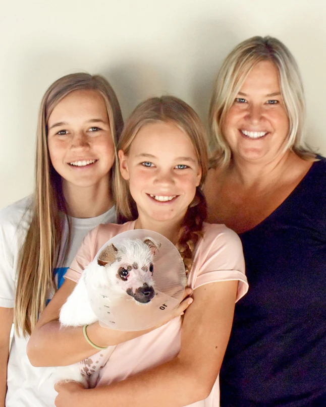 Az égési sebekkel eltorzított fejű kiskutyát, Lisát örökbe fogadták