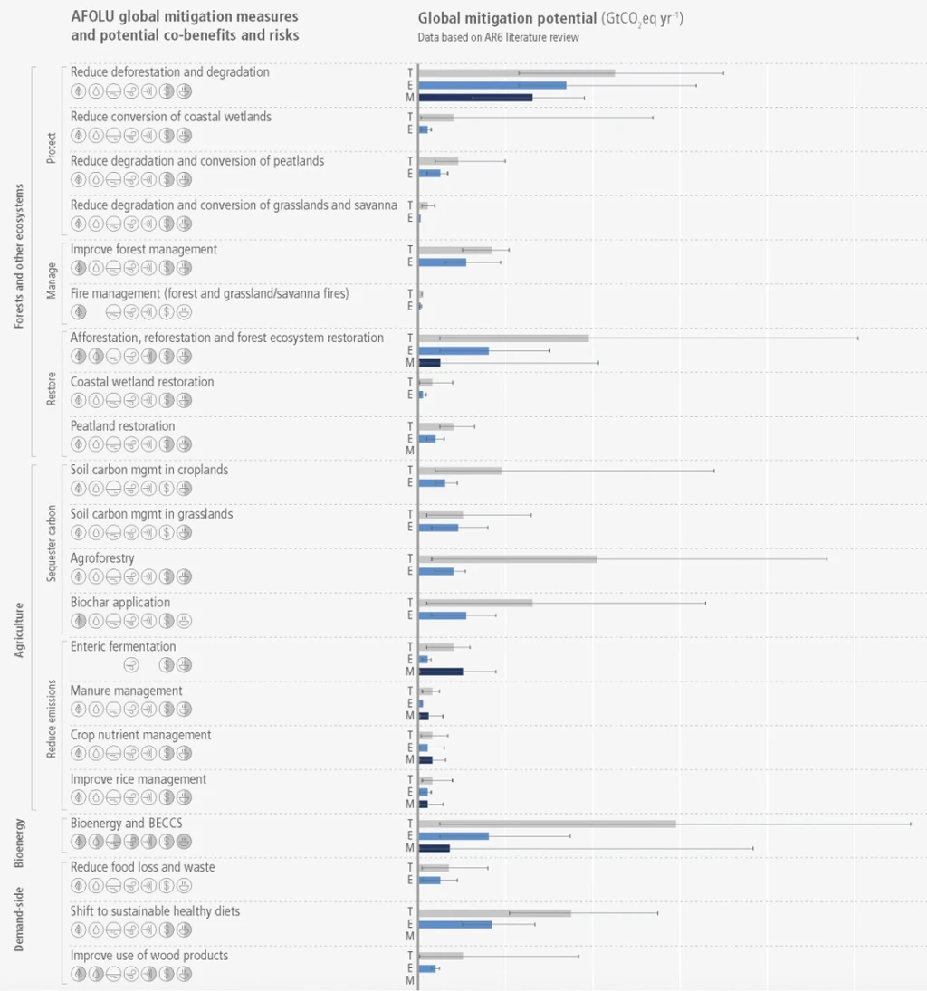 A 2020-2050 közötti időszakra vonatkoztatva az erdők és más természetes ökoszisztémák állapotát javító intézkedések adják a gazdaságos mérséklési megoldások legnagyobb hányadát. Potenciál szempontjából ezt követi a mezőgazdasági gyakorlatok javítása, a harmadik helyen pedig a kereslet és az igények megváltoztatása áll.