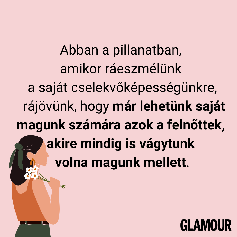 Igen ám, csak időközben eltelt néhány évtized, és most mi vagyunk a felnőttek. Akik tudnak döntéseket hozni, kommunikálni, megvannak az eszközeink és a tudásunk is arra, hogy képesek legyünk alakítani az életünket. Abban a pillanatban, amikor ráeszmélünk a saját cselekvőképességünkre, rájövünk, hogy már lehetünk saját magunk számára azok a felnőttek, akire mindig is vágytunk volna magunk mellett. Akitől megkaphatjuk a törődést, az odafigyelést, a feltétel nélküli szeretetet. Emellett pedig nevelhetjük is a belső gyermeket azokra a dolgokra, amit annak idején nem tudott elsajátítani, megtanulni. Sosincs későn képessé válni valamire, sőt. Kialakíthatunk magunkban olyan új személyiségjegyeket, hitrendszereket, melyeket használva biztonságban érezhetjük magunkat magunkkal.