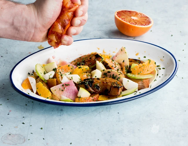 Hozzávalók: 2 db édeskömény, 5 db vérnarancs leve és 2 db héja, 1,5 teáskanál só, 2 gramm őrölt bors, 2 teáskanál csilipehely, 40ml Condimento bianco ital, 30 gramm Muscovado barna nádcukor. A tálaláshoz: 1 db vérnarancs húsa, 1 db narancs húsa, 2 db friss retek, 1 db zöldalma szeletelve, jégcsap retek felkockázva, snidling