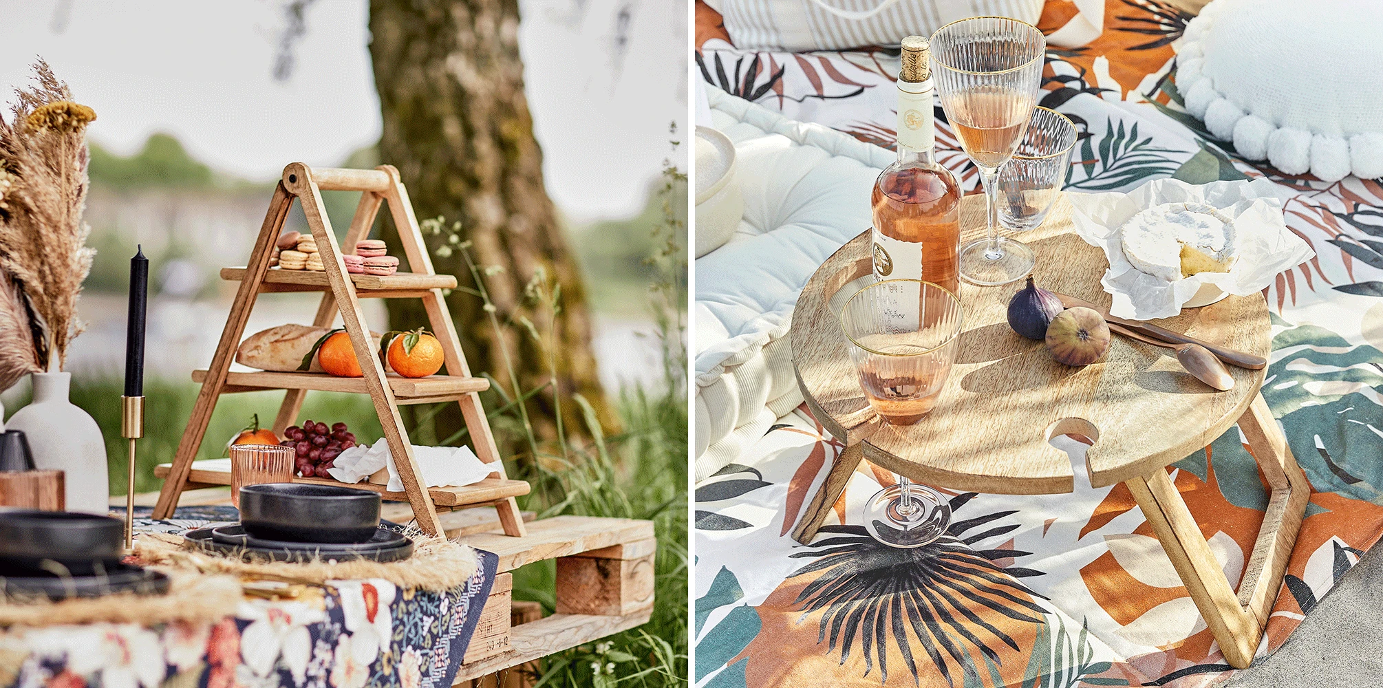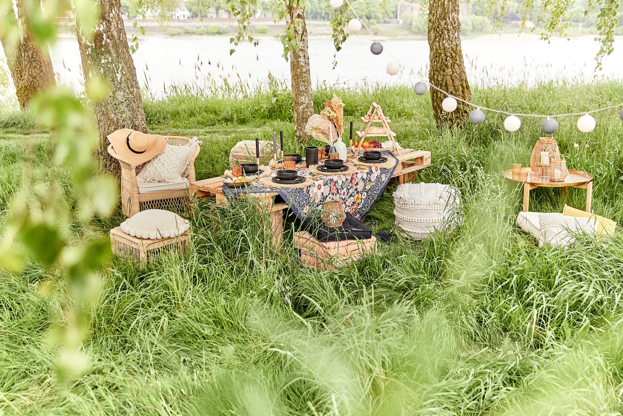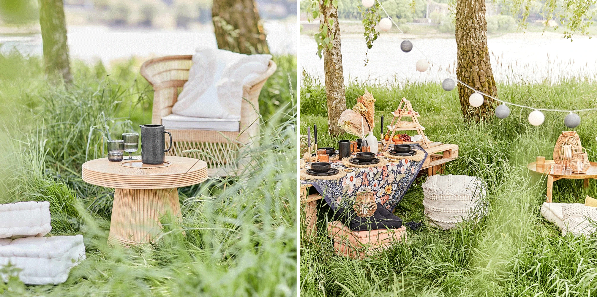 Dobd fel a pikniket bútorokkal! Párnák, párnák és párnák…na meg a puffok. Egy igazi bohém hangulatú piknikhez válaszd a BOHO LOUNGE vagy ALL NATURE puffot, ha pedig párna, akkor érdemes a hagyományos- és ülőpárnákat keverni ‒ nemcsak jól mutatnak a különböző színű és mintájú párnák együtt, de praktikusak is. Hűvösebb napon vagy ha estére is maradnátok, készülhetsz takarókkal is. Asztalként használhatsz raklapokat, ha pedig kisebb sarkokat alakítanál ki, a rattanból készült, kerek BOHO LOUNGE asztal tökéletes választás lehet.