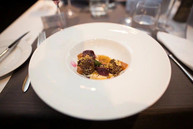 A La Perle Noire étteremben tartott különleges vacsorán egyedi, erre az alkalomra összeállított menüsor keretében kóstolhattuk meg mi is a tálat, amellyel Sándor Rodrigo megnyerte a nemzetközi gasztronómiai verseny kelet-európai regionális döntőjét, és amellyel bejutott a világ 20 legjobb fiatal séftehetsége közé.