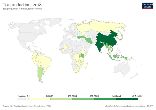 A teacserjék szubtrópusi éghajlaton teremnek a legjobban. Az ültetvények számára az optimális hőmérséklet a 18–32 °C közötti tartományban van. A csapadékmennyiség évi átlagos összege meghaladja az 1000 mm-t a teatermelő területeken, de az ideális havi csapadékmennyiség és annak eloszlása a különböző régiókban eltérő lehet (kb. 223-417 mm/hónap). Fontos a talaj minősége, telítettsége is – ha vízhiányban szenved, az a tea termésátlagában is változékonyságot eredményez. A tengerszint feletti magasság is lényeges szempont a termesztés szempontjából: a legkedvezőbb a 2000 m-es magasság, ahol nem túl magas a hőmérséklet és kevesebb a napfény, mint az alacsonyabb térszíneken, ugyanis az erős napfénynek való kitettséget nem szereti a teacserje.