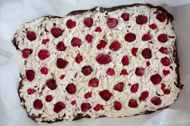 A vajat és a csokoládét olvaszd fel, majd keverd bele a barna cukrot. Add hozzá a vaníliás cukrot, és egyesével a tojásokat is, végül a sütőporral vegyített lisztet, majd keverd össze. Egy kisebb sütőformát kenj ki vajjal, öntsd bele a masszát. A sütőt melegítsd elő 190 fokra. A ricottát tedd egy tálba, add hozzá a porcukrot, a vaníliás cukrot, a tojást, a reszelt citromhéjat, és kézi habverővel keverd simára. Ezután keverd bele a vaníliás pudingport is. A sütőformában lévő massza tetejére óvatosan öntsd rá a ricottás keveréket, egyenletesen simítsd el, és szórj a tetejére kiolvasztott, lecsöpögtetett málnaszemeket. A tésztát tedd az előmelegített sütőbe és alufóliával letakarva süsd 40 percig, majd vedd le a fóliát és süsd további 10 percig.