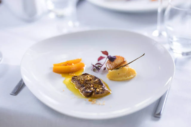 Fésűkagyló és serpenyőben sült kacsamáj duó, sáfrányos – vaníliás birsalma
