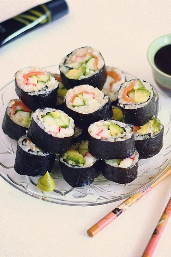 Hozzávalók: 10 dkg szeletelt lazacfilé olajban, 1 kaliforniai paprika, 15 dkg sushi rizs, 1/2 evőkanál 3%-os rizsecet, 1 evőkanál vízitormakrém/wasabi, 2 db nori/szárított algalap, 1 kávéskanál cukor, só, szójaszósz
