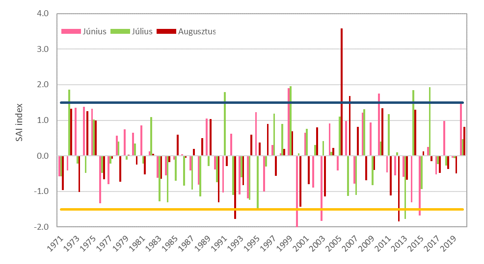 Az egyes nyári hónapok csapadékösszegeit tekintve is kirajzolódik, hogy a szélsőségesebb mennyiségek jellemzően 1990. után fordultak elő. Ennek szemléltetésére egy egyszerű mutatót tekintettünk (standardizált csapadék anomália index – részletes leírás a cikk végén olvasható). E szerint az elmúlt 50 év nyári hónapjaiból kilenc olyan volt, amikor komoly nedvesség lépett fel, hat esetben pedig a szárazság volt jelentős (ez utóbbiak mindegyike 1990. után jelentkezett). Nedvességet tekintve a legkiemelkedőbb 2005 augusztusa volt, a szárazságot illetően pedig 2000 júniusa szerezte meg az első helyezést.