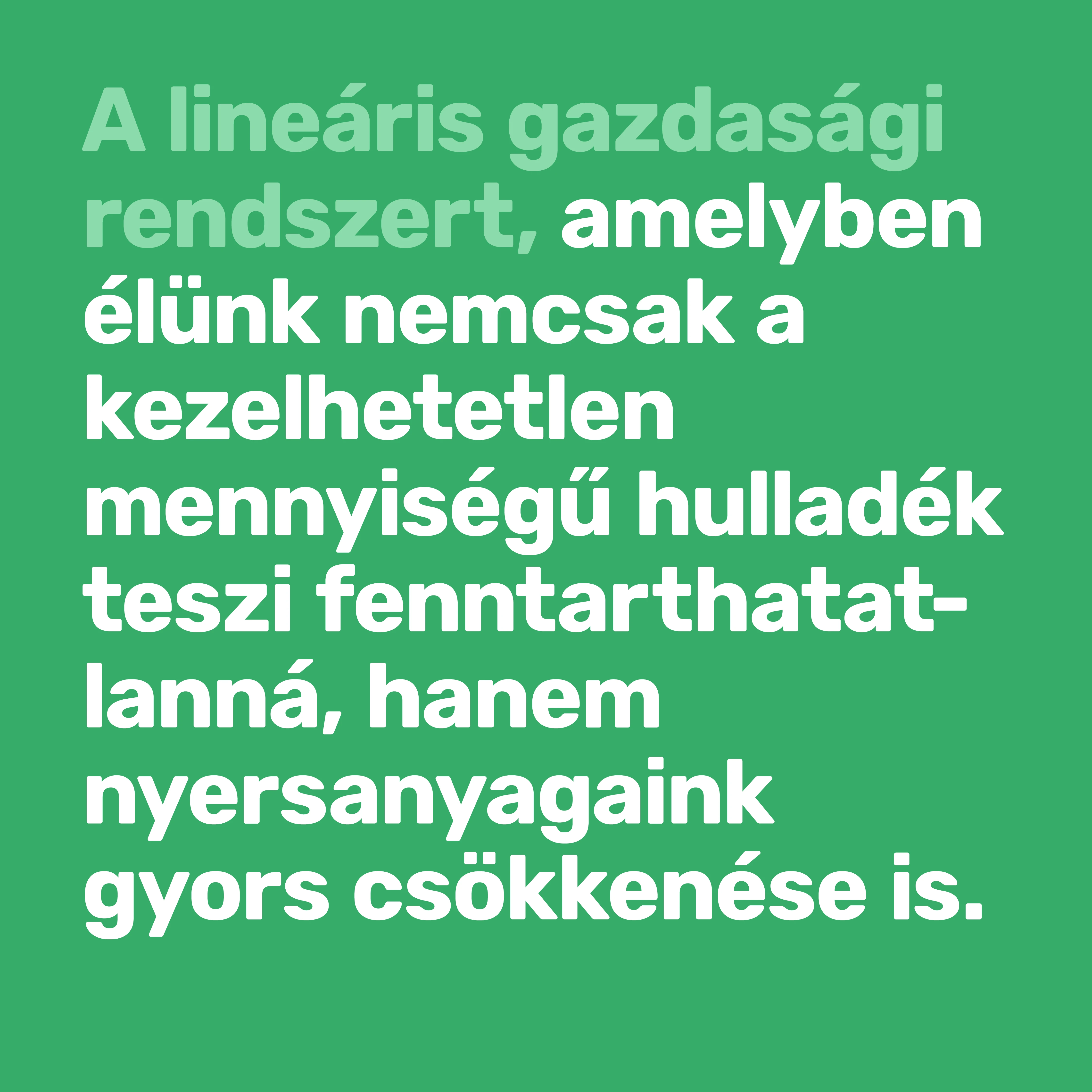 A mostani, rendkívül pazarló gazdasági modellünkkel gyerekeink és a fiatalok erőforrásait éljük fel: ha továbbra is a termelés-fogyasztás-haszon háromszögében mozgó lineáris gazdasági rendszert működtetjük, akkor pár évtizeden belül olyan kulcsfontosságú nyersanyagok fogyhatnak el, mint az ezüst, az arany, a cink vagy az ólom. Európa különösen kitett, mivel a legszegényebb nyersanyagkészlettel rendelkező kontinens. Bár a körforgásos gazdaság sokkalta több, mint az újrahasznosítás, igazi felfutását mégis az eredményezte, amikor a fejlődő országok, élükön Kínával, nem fogadták be többé a fejlett világ hulladékát. A termelés hatékonyságának a fokozása már rég nem elég, teljes paradigmaváltásra van szükség. Muszáj csökkentenünk a gazdaság anyaghasználatát, ami a környezet- és klímavédelmi célok teljesülésén túlmenően helyi és globális szintű konfliktusok elkerülését is lehetővé tenné.