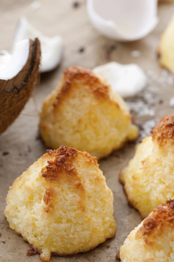 Így készítsd el: tedd hozzá a kókuszreszelékhez a cukrot, a juharszirupot, a tojásfehérjét, villával majd verd össze egy picit. Ezután formázd a gombócokat, és helyezd őket a szilikonos sütőpapírral bélelt tepsibe. Süsd közepesen meleg sütőben.