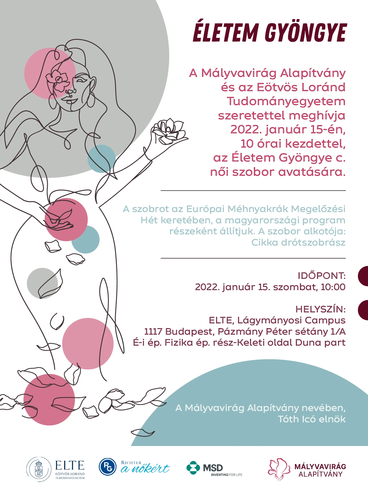 Itthon 2014 óta az alapítvány szervezésében zajlik az Európai Méhnyakrák Megelőzési Hét, idén január 17-e és 23-a között rendezzük meg. Egy gyöngyszem az esemény jelképe, ami összeköti az országokat. Ezúttal az „Életem gyöngye” a szlogen, ami tulajdonképpen a HPV elleni védelmet szimbolizálja. Kétszáz település csatlakozik hozzánk, a településeknek szóróanyagot juttatunk el és aki tud az valamilyen kis programmal kapcsolódik vagy csak egyszerűen online becsatlakozik. A résztvevők gyöngyökből karkötőket fűznek, majd ezeket eljuttatják azoknak a nőknek a különböző kórházak nőgyógyászati osztályára, akik épp valamilyen beavatkozáson esnek/estek át, fontos, hogy érezzék nincsenek egyedül. Emellett a Mályvavirág pontjaink is bekacsolódnak a megelőzési hétbe, ahol az idei évben kis mályva virágszobrokat fogunk állítani Cikka drótszobrász közreműködésével, aki egy 220 centis női drótszobrot is tervezett a kampányban. A női alak egyik keze az ég felé néz, ezzel jelképezve a HPV elleni prevenciót, a másik a méh felé mutató kéz pedig az emlékezést szimbolizálja azokért a nőkért, akiket valamilyen nőgyógyászati daganatos betegség következtében veszítettünk el. Nagyon büszkék vagyunk rá, hogy az ELTE partnerségre lépett velünk. Január 15-én Lágymányosi Campusnál lesz reggel 10 órától a szoboravatás, aminek állandó helyet biztosítanak, ezzel is jelképezve mennyire fontos az élet. A fentieken túl pedig Mészáros Árpád Zsolt színművész és párja Piros Krisztina, - Pécsváradi Zoltánnal- egy dalt is készítettek az alkalomra „Éltem gyöngye, te legyél az első” címmel, amit a közönség először a megnyitón fog hallani.