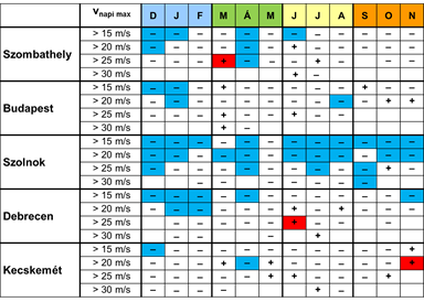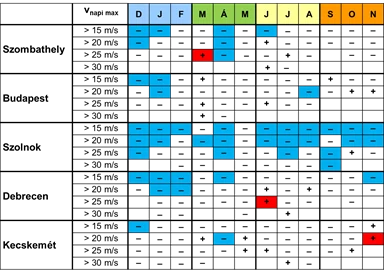 Széllökés indexek havi változásának iránya a vizsgált időszakban hazai homogenizált mérési adatsor alapján (1975–2013). A színes mezők a 95% megbízhatósággal szignifikáns változásokat jelzik. A szerző ábrája.