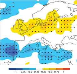 A maximális szélsebesség 98 százalékának éghajlati modell-szimulációkból számított 2071–2100 közti átlagának változása m/s-ban az 1961–2000 időszakhoz képest. A sárga területek növekedést, a kék területek csökkenést jeleznek. A fekete pontok a statisztikailag szignifikáns változásokat mutatják (95%-os megbízhatósággal).