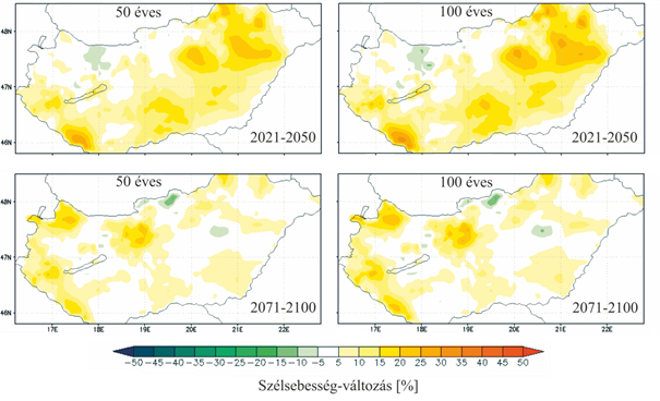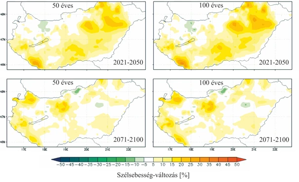 Az ELTE TTK Meteorológiai Tanszékén futtatott egyik, a térségre adaptált regionális éghajlati modell (RegCM) szélmezőiből statisztikai módszerekkel (ld. extrém értékek vizsgálatának statisztikája) számított visszatérési értékek is emelkednek mindkét vizsgált jövőbeli harmincéves periódusra (2021-2050, 2071-2100). Az alábbi ábra a maximális szélsebességek várható változását szemlélteti: a sárgás színezés az emelkedést, a zöld a csökkenést jelzi. Az ország nagy részén 5-10 százalékkal nagyobb lesz az a szélsebesség maximum, mely 50 vagy 100 év alatt várhatóan egyszer következik be. Átlagosan a rácspontok 12-18%-ában várható csökkenés, a 100 éves visszatérési idő átlaga a referencia időszakban (1961-1990) 17,8 m/s, mely a modell szerint 2021-2050 között 20,1 m/s, 2071-2100 között 19,4 m/s értékre növekszik.