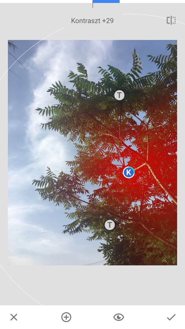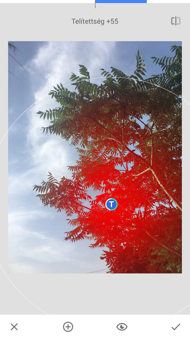 A Snapseed legjobb funkciója, hogy kijelölheted a módosítani kívánt terültet egy kis pont hozzáadásával, majd változtathatod a fényesség erősségét, a kontrasztot, telítettséget és a struktúrát.