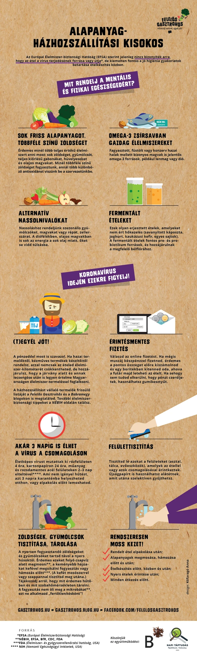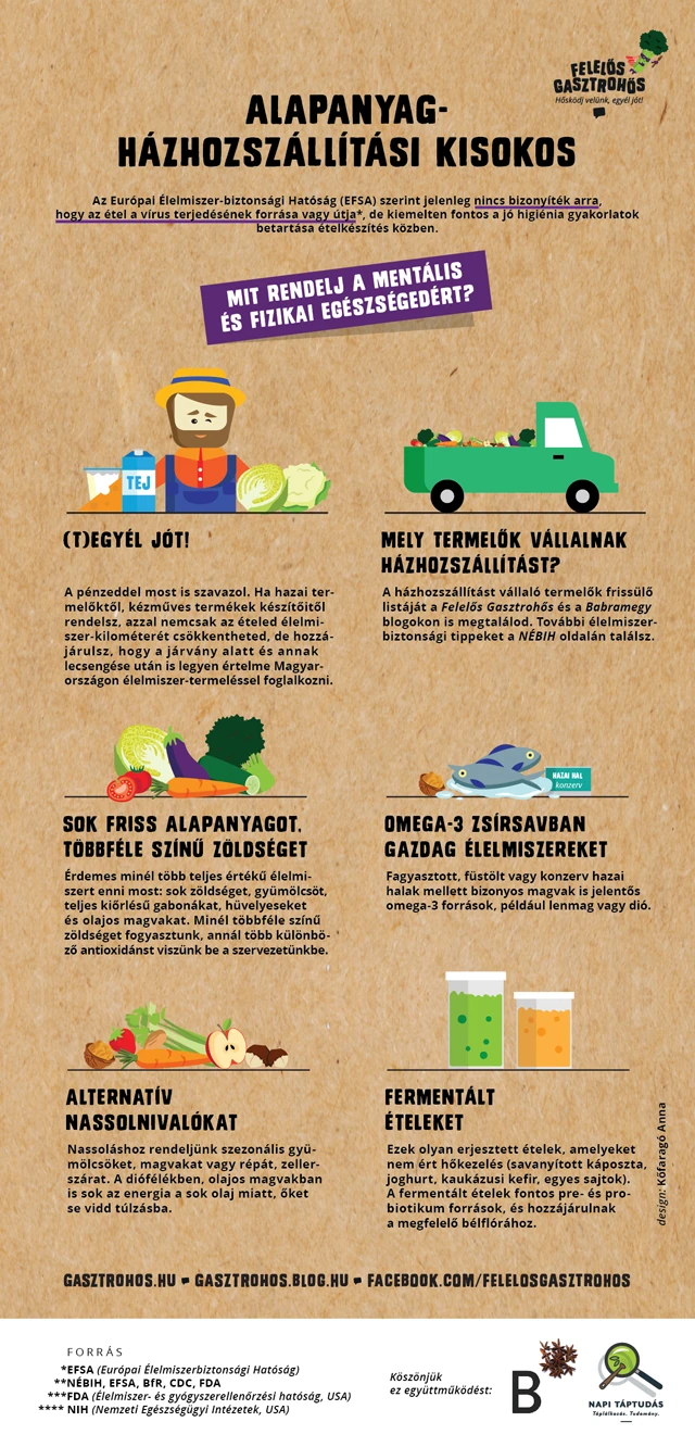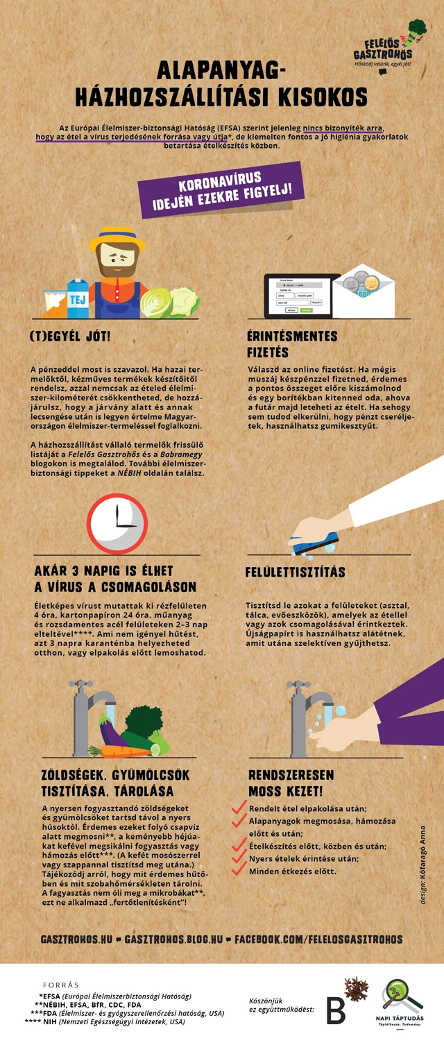A Felelős Gasztrohős Alapítvány, a Napi Táptudás és a Babramegy blog szerzőivel, Kőfaragó Anna grafikus segítségével infografikákba foglalta a hasznos információkat, jó higiéniai gyakorlatokat, melyekre érdemes odafigyelnünk, ha készételt, vagy alapanyagokat rendelünk otthonunkba.