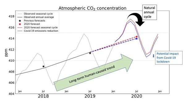 A számítások szerint mindössze pár tized ppm-mel lett kisebb a 2020-as éves átlagos növekedés értéke, mint ha nem lettek volna lezárások – ez azt jelenti, hogy a légköri koncentráció szintje kisebb ütemben nő (de tovább nő!), mint arra a korábbi trendek alapján következtetni lehetett. Egyrészt a kibocsátás-csökkenés csak ideiglenes (már 2020 második felében újra emelkedni kezdett a kibocsátás), másrészt