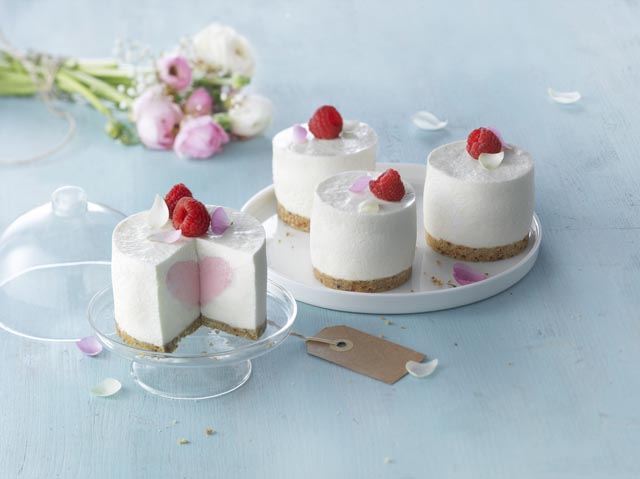 Díszítsd ehető rózsaszirmokkal és málnával.