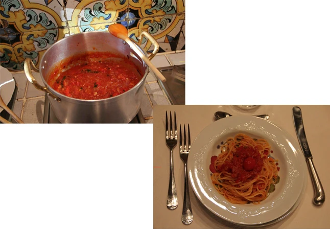 A Spagetti Napoletana elkészítésével kezdtük a közös főzőcskét. Számomra az olasz tésztaételek eddig a "könnyen, gyorsan elkészíthető" kategóriába tartoztak. Ezen a toszkán délutánon azonban megtudtam, hogy a spagetti készítésnek is megvan a maga művészete. Nem mindegy, hogy hány percig és mennyi olajon rotyog a hagyma, milyen húsos a paradicsom, a tésztafőzési praktikákat nem is említve…