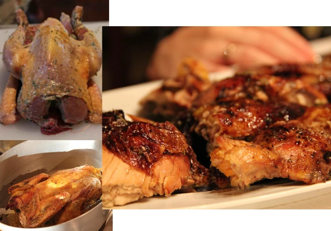 Az előkészített, rozmaringgal, fokhagymával, citromhéjjal, vajjal készült masszával megkenjük a szárnyast. A fazékba oliva olajat tettünk, és a gyöngytyúkot két oldalán aranybarnára sütöttük. Aztán az aprított fokhagymagerezdek, a különleges gyógynövények, és további citromhéjak következtek. Borsoztuk, sóztuk a húst, és 2 perc múlva a Marsalát, további 5 perc elteltével a vörösbort öntöttük hozzá. Lefedve a legalacsonyabb fokozaton sült a hús, amíg meg nem puhult. Legalább 1 órára van szüksége a húsnak, nem árt 10 percenkén ellenőrizni, és ha szükséges, hozzáadni 1-1 pohár vizet. Végül szósszal gazdagon leöntve tálaltuk a felszeletelt, omlósra sült gyönygytyúkot…