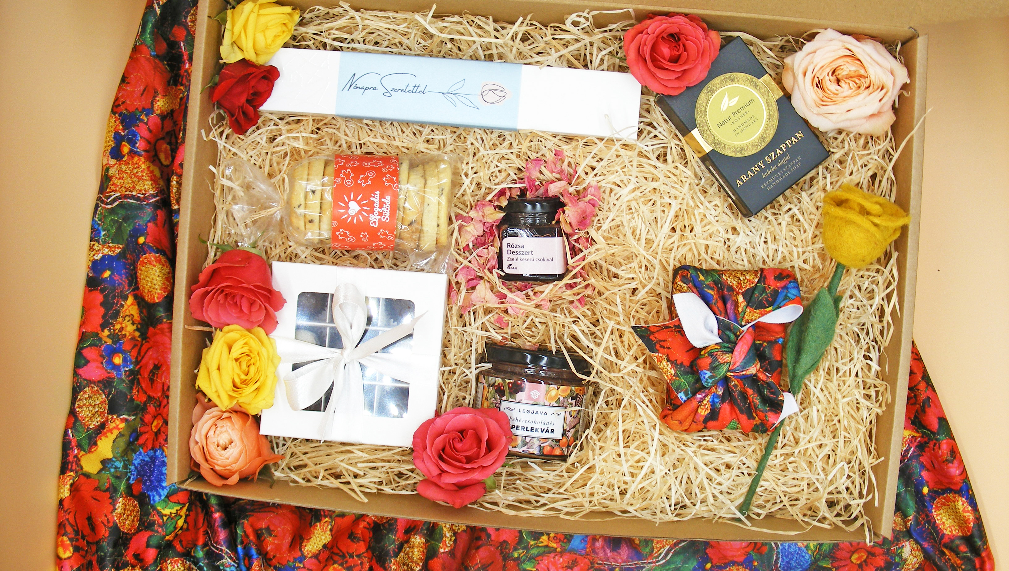 A gourmet-válogatás tartalmaz egy belga csokoládés rózsadesszertet a Cserehátról, levendulás vajas kekszet Monorról, homokhátsági fehércsokoládés eperlekvárt, csokoládéba mártott birsalmasajt bonbonokat, kubeba olajos aranyszappant, sós karamellel töltött bonbonokat Szekszárdról és egy autisták által készített nemezrózsát.