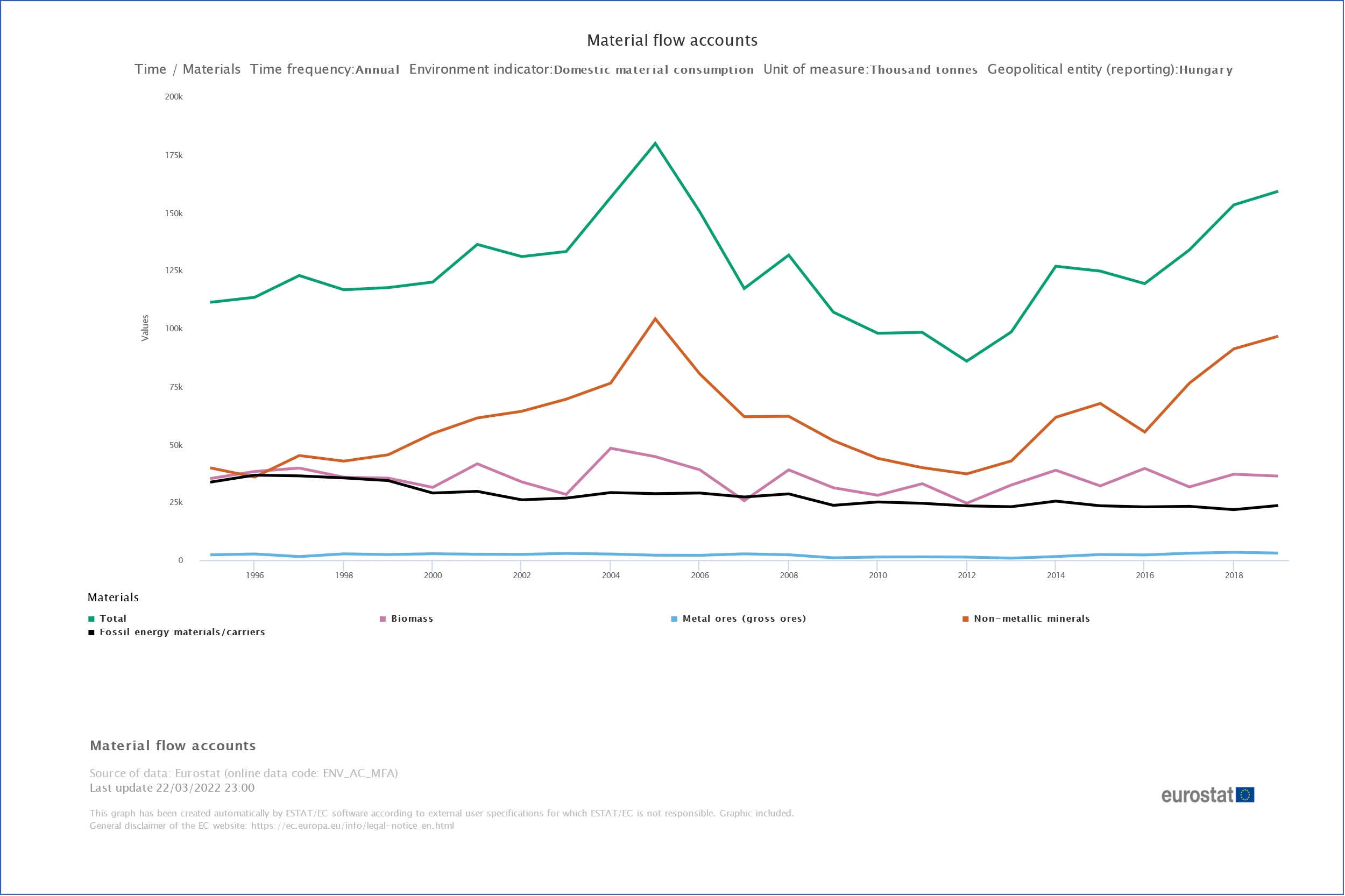 Ha megnézzük a 2012 után kezdődő időszak adatait, jól látható, hogy anyaglábnyomunk, karbonlábnyomunk, és egyébként belföldi szén-dioxid kibocsátásunk is növekedett. Az Eurostat adatbázisa alapján a hazánk által felhasznált természeti erőforrások megugrása szinte kizárólag a „nem-fémes ásványok” felhasználásának köszönhető, melyek 95%-ban építőanyagot jelentenek.