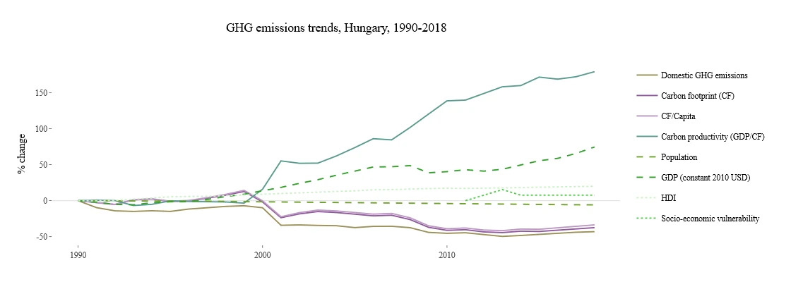 Visszatérő szólam a magyar klímapolitikában, hogy a kibocsátásaink jelentősen csökkentek, így jogtalanok a felénk támasztott uniós kibocsátáscsökkentési célok és ambíciónövelés. Az igazság ezzel szemben az, hogy kibocsátásaink nagyon kismértékben csökkentek a tervszerű cselekvésnek köszönhetően, azokat szinte minden esetben fájdalmasan elszenvedte a magyar gazdaság és társadalom, legyen szó az államszocialista nehézipar összeomlásáról a rendszerváltáskor vagy a 2008-as pénzügyi válságról. A többi környezeti mutatóban pedig még rontottunk is, Magyarország anyaglábnyoma közel 20%-al magasabb, mint közvetlenül a rendszerváltás után, 1992-ben.