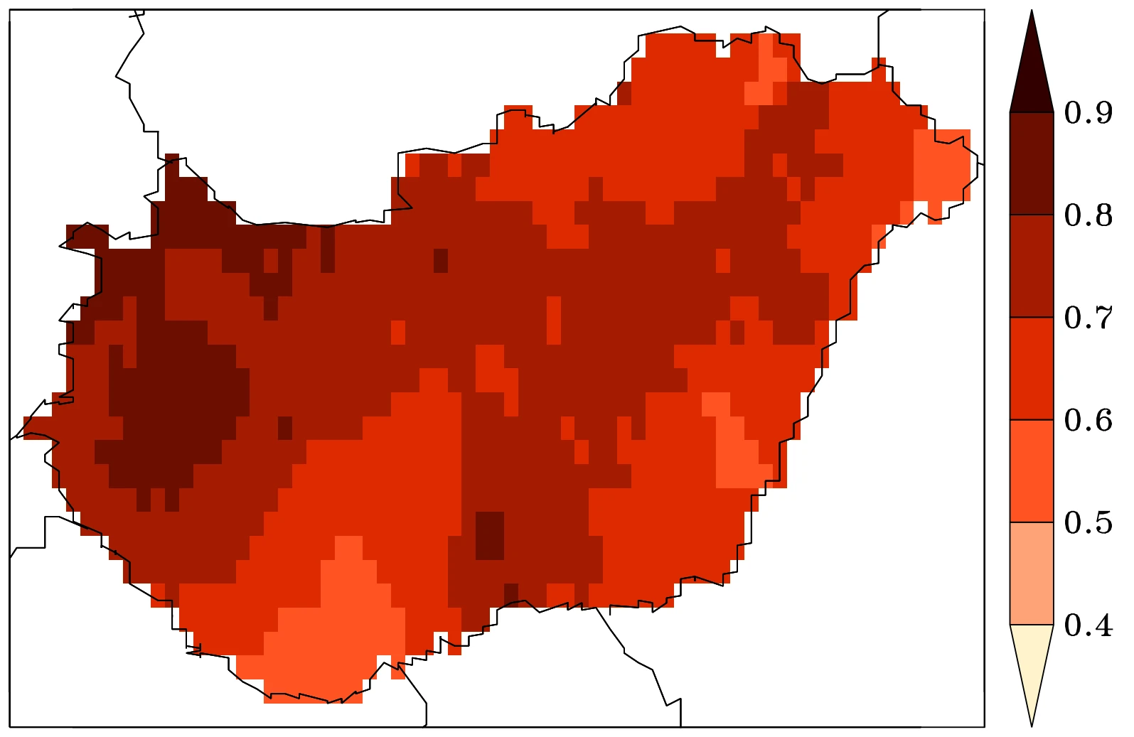 A térbeli szerkezetet kialakító okok – tehát a trópusi területekhez való relatíve közelebbi elhelyezkedés és a kontinentális hatás – változatlanok, így a 6. ábra szerint az ország déli, délkeleti felén várhatjuk továbbra is az évi legmelegebb nappali hőmérsékleteket. Az antropogén hatás jövőbeli alakulása persze a növekedés mértékében eltér: míg a pesszimista kibocsátást követve az Alföldön minden évben 40 °C-os maximumokra számíthatunk a század utolsó két évtizedében, addig az optimistább jövőkép szerint inkább “csak” 38 °C-ra.