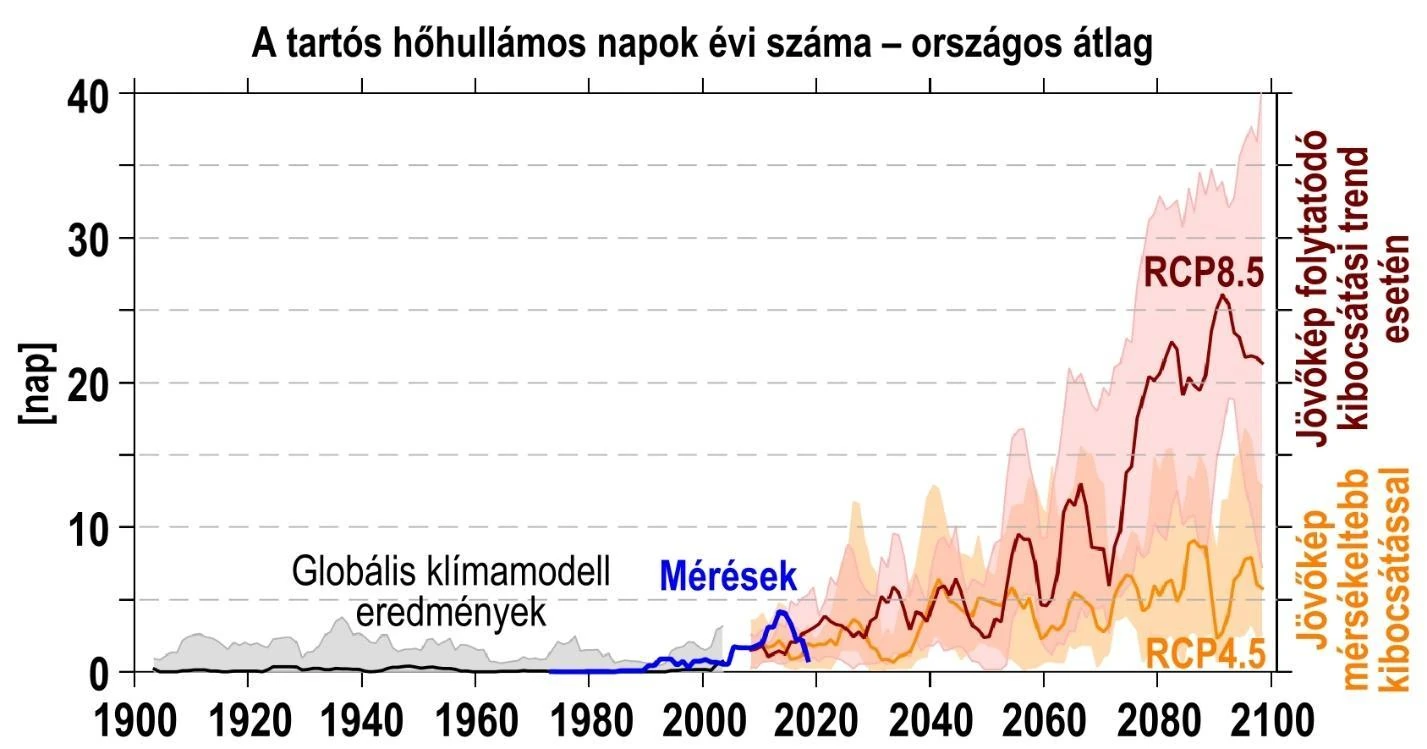 az utóbbi esetében a század végére 30 nap felett várhatjuk éves átlagban a tartós hőhullámos napokat a legjobban kitett alföldi térségekben. Ez egyes években akár a nyár felét is jelentheti.