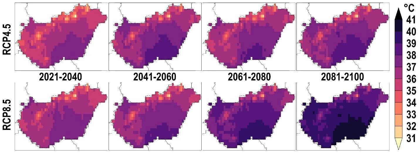 A jövőt vizsgálva megállapíthatjuk, hogy gyakorlatilag a jelenlegi trend folytatására kell felkészülnünk a pesszimista jövőkép szerint, és a század végén minden egyes évben a közelmúltban (2007-ben) még a legextrémebbnek számító 39 °C fölötti országos átlagokra számíthatunk. Ezzel szemben a mérsékeltebb kibocsátásokkal az éves maximumok 37 °C körüli tetőzésével kevésbé forrón tarthatnánk nyaraink legmelegebb napjait is (5. ábra, narancs és piros sáv).