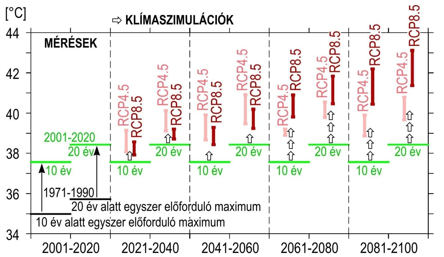 Az eltolódás a modelleredmények bizonytalansága mellett a jövőben is folytatódik: a század végén a zöldebb jövőkép szerint 20 év alatt átlagosan egyszer számíthatunk 40-41 °C-okra, ugyanakkor a pesszimista szcenáriót követve az ijesztően magas 43 °C-os országos átlag lesz a 20 évente egyszer előforduló jellemző érték.