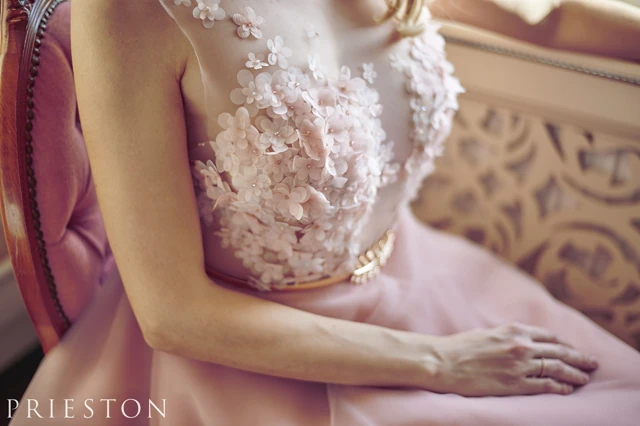 A kollekcióhoz természetesen a márkától már megszokott, magas minőségű anyagokat használtunk fel, mint a különböző selymek, szaténok, tüllök és organzák. Díszítőelemként megjelenik a Prieston-ra jellemző virágmotívum is, ezúttal saját, grafikus által tervezett, lézervágott verzióban, amiket apró kristályokkal egészítettünk ki. Mind a virágok, mind a kristályok kézzel, egyessével lettek felvarrva a ruhákra, így az elkészülési idejük akár hosszú hetekbe is beletelt.