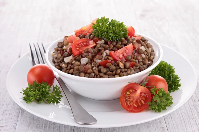 Hagymás lencsesaláta paradicsommal