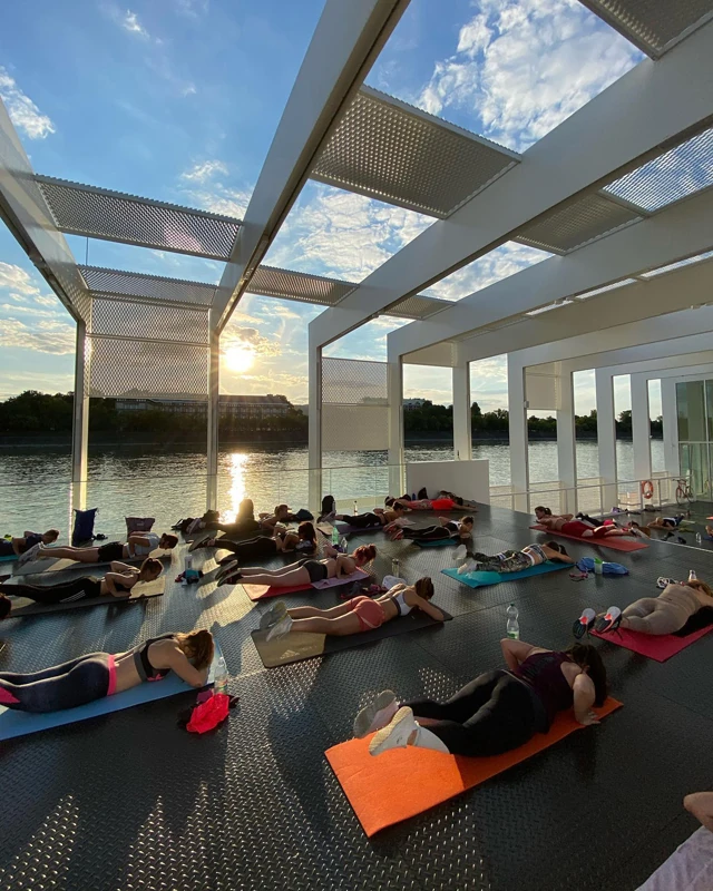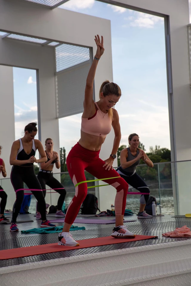 Lenyűgöző környezetben, a Stopper Úszóház panorámateraszán tartja folyamatos teltházban Body Shape edzését Debreczeni Dóri, a népszerű edző és modell.