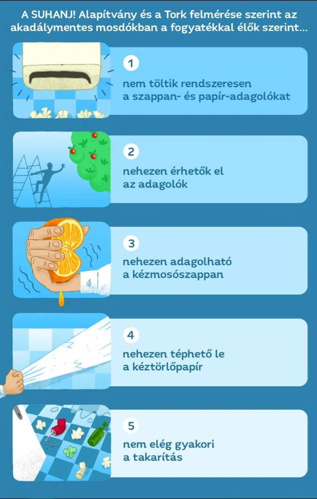 A SUHANJ! Alapítvány és a Tork felmérése szerint az akadálymentes mosdókban a fogyatékkal élők a leggyakrabban előforduló problémák között említik, hogy nem töltik rendszeresen a szappan és papír adagolókat, nehezen érhetők el az adagolók, nehezen adagolható a kézmosószappan, nehezen téphető le a kéztörlőpapír, nehezen adagolható a toalettpapír, nem elég gyakori a takarítás.