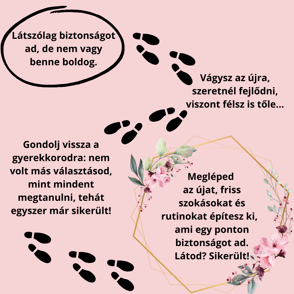 Ennek felismerése pedig talán az egyik legfontosabb dolog, ami támogat bennünket az új felé való elindulásban: hogy ott is lesz majd egy komfortzóna, ahol újra biztonságban és otthonosan érezhetjük magunkat. Ennek megértésével pedig rájövünk, hogy igazából semmit nem vesztettünk azzal, hogy elhagytuk a régit. Hiszen a tudást, a tapasztalást, amit korábban megéltünk, az emlékeket mind magunkkal hoztuk, ehhez kaptuk csak pluszban az újban rejlő lehetőségeket. Amikor pedig ki tud nyílni előttünk ez az új világ, képesek leszünk élvezni annak minden szépségét és újdonságát, rájövünk, mennyivel jobb itt. Ezért az érzésért pedig megérte végig csinálni az egész folyamatot. Aki pedig egyszer képes volt rá, szerzett róla egy konkrét és sikeres forgatókönyvet, annak akárhányszor menni fog!