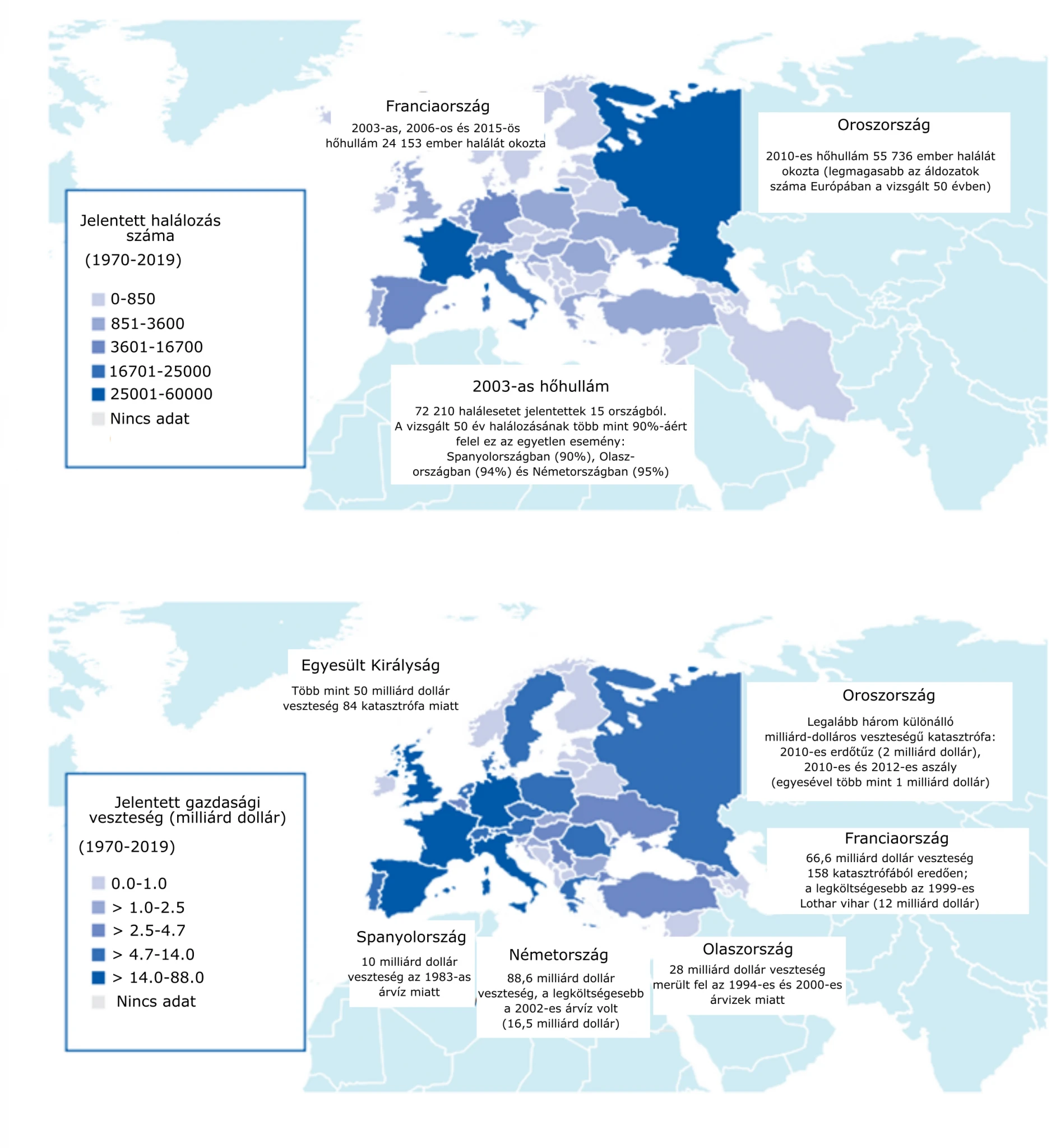 Európában az 1970–2019 között feljegyzett időjáráshoz köthető 1672 katasztrófa összesen kb. 160 000 fő halálát okozta és 476,5 milliárd dollár gazdasági veszteséget eredményezett.