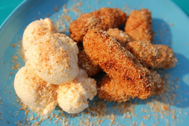 6. Konyhai papírtörlővel itasd fel az olajt és fagylalttal valamint pirított kókuszpehellyel szolgáld fel.