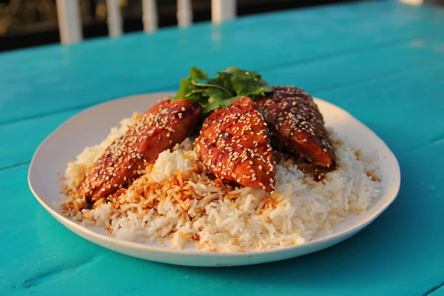 8. Helyezd a csirkét a rizs tetejére. Pirítsd meg a szezámmagot egy serpenyőben és szórd a csirkére. Díszítsd koriander levelekkel.