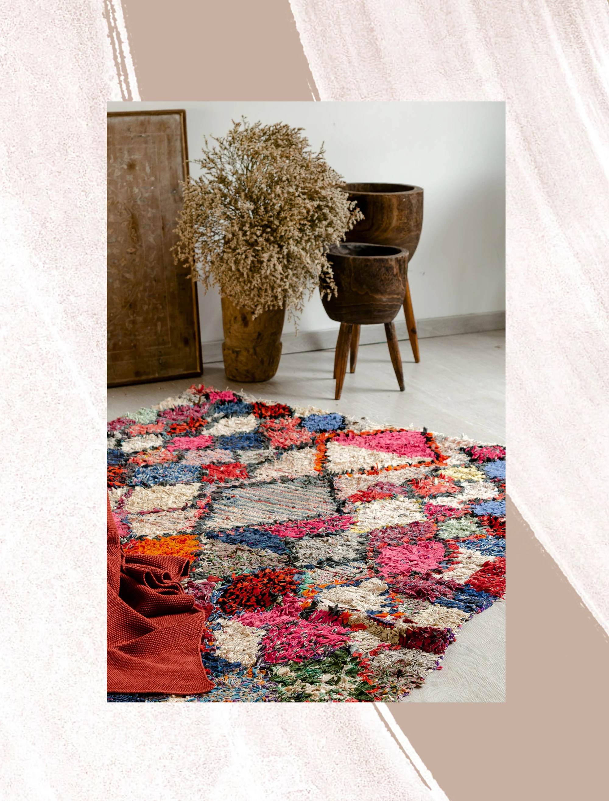 Újra feldolgozott ruhaanyagokból készült marokkói rongyszőnyeg (Boucherouite)