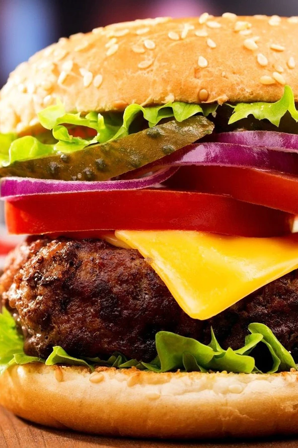 A húst sóval, borssal, apróra vágott vagy reszelt hagymával keverd össze. Formálj nyolc kb. 11-12 cm átmérőjű, egy centi vastag pogácsákat a masszából, majd süsd ki. Közben salátát mosd meg, szedd leveleire, karikázd fel a hagymát, az uborkát és a paradicsomot. A sajtot szeleteld fel, a zsömléket vágd félbe. A megpirított zsömle aljára tedd a sajtot, rá a forró húspogácsát, majd salátalevelet, paradicsomot, hagymát, és uborkakarikákat. A zsömle tetejét kend meg mustárral, ketchuppal, majonézzel, és végül illeszd össze az aljával.