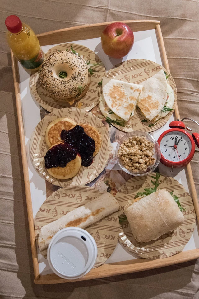Az étteremlánc fő profiljával ellentétben a KFC Reggeli nem kizárólag a csirkehúsra, hanem a friss, hazai tojásra helyezi a hangsúlyt. Az ajánlat részét képezik a tükörtojással és friss zöldségekkel gazdagított Ciabatta, Bagel, Reggeli Qurrito és a kívül ropogós, belül omlós Háromszög Szendvicsek, valamint a sajttal töltött Roller. A szendvicsekbe kerülő tükörtojást a KFC 11 összetevőt tartalmazó, titkos fűszerkeverékével ízesítik. Az ételeink mellé választhatunk hosszú kávét, lattét vagy kapucsínót, az édesszájúak pedig amerikai palacsintával, csokoládés süteménnyel vagy málnás sajttortával kényeztethetik magukat. A könnyedebb ételekre vágyók viszont joghurtot is találnak majd a KFC új reggeli kínálatában.