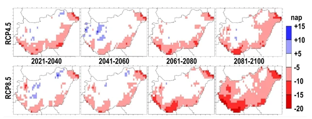 - A változást két hosszabb, legalább 20-éves időszak átlagainak vagy összegeinek különbségére, jelen tanulmányban napban kifejezve adjuk meg. Egy idősorra illesztett trend pedig azt fejezi ki, hogy mekkora az adatsorban az adott idő alatt bekövetkezett átlagos változás, mely lehet negatív vagy pozitív előjelű. A trendegyütthatók (a teljes időszakon tekintve) mindegyikét lineáris regresszió illesztésével, a gyakran alkalmazott legkisebb négyzetek módszerével határoztuk meg. Minden egyes idősorra, a modellekre külön-külön, statisztikai t-próbával megvizsgáltuk, hogy az adott változás vagy trend szignifikáns-e, melyet erősen befolyásol a belső változékonyságot reprezentáló évek közötti változékonyság, azaz a szórás nagysága. Az eredményeket 80%-os megbízhatósági szint mellett közöljük.