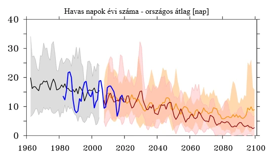 Az elmúlt 40 év alatt 15 napról 11 napra csökkent a havas napok (amikor legalább 1 cm hó hullott) éves száma, azonban a csökkenés pont az elmúlt 10 évben lett látványosabb. Országos átlagban utoljára 2013-ban volt példa az egész országot érintő nagy havazásra. A legnagyobb csökkenés az összes havas napok számában épp az eddigi leghavasabb országrészben, Északkelet-Magyarországon történt. Ha a modellszimulációkba belevesszük az emberi kényszerhatást (üvegházhatású-gázkibocsátásokat), akkor csak 50%-os bizonyossággal állíthatjuk, hogy a csökkenésért az emberi tevékenység a felelős. Ha azonban az eddigi mértékben folytatjuk a légkör üvegházgázokkal való telítését, és a pesszimista forgatókönyv érvényesül, akkor a század végére kétharmaddal csökkenhet, és évi 5 nap alá mehet országos átlagban a havas napok száma. A területi eloszlás változékonysága miatt ez azt is jelentheti, hogy egyes országrészekben akár évekig nem lesz jelentős havazás. Szabó Péter és Pongrácz Rita elemzése a Másfélfok.hu-n.