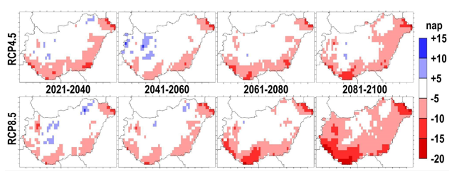 5 nap alatti országos éves átlagok lehetnek majd a század vége felé, mely az összes havazásos napban kétharmaddal való csökkenést jelent a 21. század elejéhez képest.