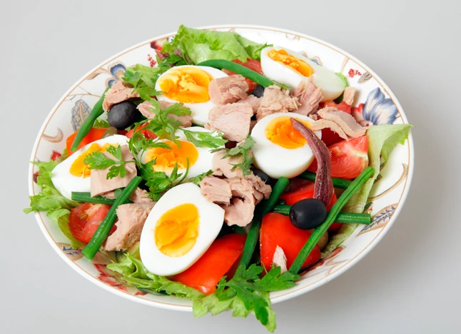 Mediterrán saláta tojással, tonhallal és citromos vinaigrette öntettel