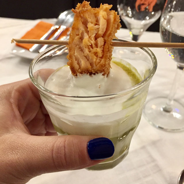 1. Kezdésnek egy Pauwell Kwak sörrel, parajjal és koranderrel készült "cappuccinót" szolgáltak fel házi tejszínhabbal és lazac falatokkal.
