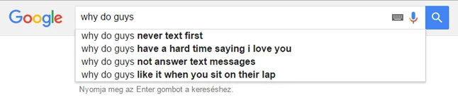 Kezdjük azzal, hogy ez nem az én ötletem volt, hanem loptam. Már nem is tudom, honnan. Ott nem férfiakat kérdeztek, és nem ilyesmiről, de az elv ugyanaz. De az internet napja alatt nincs új úgysem, úgyhogy ezt nem érzem plagizálásnak. Szóval: beütöttem a Google keresőbe, hogy "why do guys…", és az első három kérdést föltettem három különböző életkorú és foglalkozású férfinak, mert feltételeztem, hogy azok igencsak érdekelhetik a nőket.