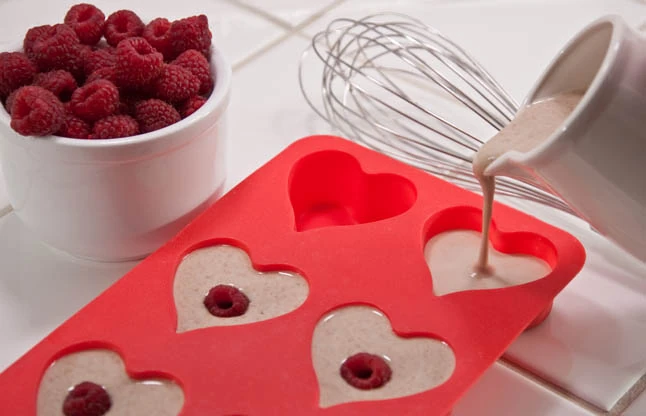 Hozzávalók: 12 darabhoz: 25 dkg liszt, 2 és fél kávéskanál sütőpor, fél kávéskanál szódabikarbóna, 1 tojás, 13 dkg cukor, 1 csomag vaníliás cukor, 1 dl olaj, 2,5 deci kefir, 5 dkg keserű csoki, 15 dkg málna (mélyhűtött vagy friss), szív alakú sütőforma