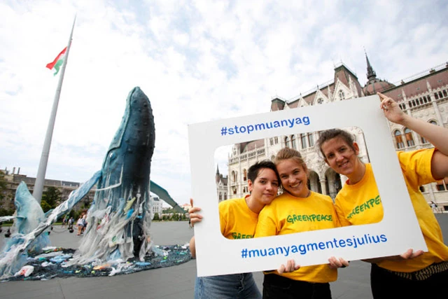 Hulladéktengerből kiemelkedő, hatalmas bálnák a Kossuth tér betonján? Igen. a Greenpeace tette oda őket.