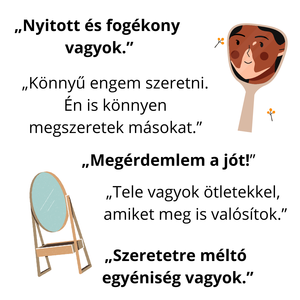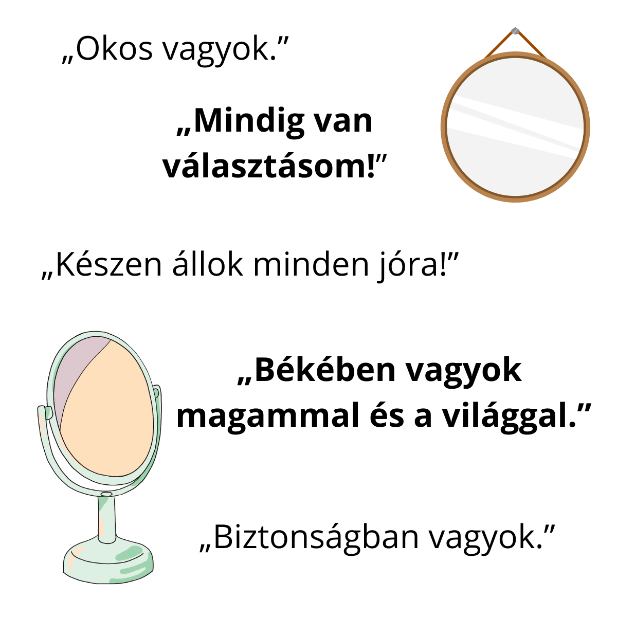 Egész egyszerűen állj a tükör elé, nézz bele a saját szemedbe, és kezdj el megerősítő mondatokat mondani magadnak – úgy, hogy halld. Többször, egymás után. Ezt végezd minden egyes nap, és ígérem, már néhány nap után érezni fogod a hatást!